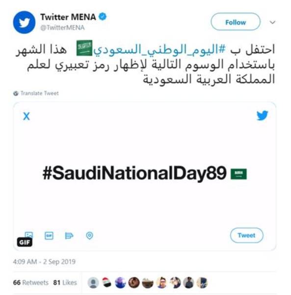 وأطلق «الطائر الأزرق» رمزاً تعبيراً لعلم المملكة يظهر عند التغريد باستخدام وسم #اليوم_الوطني_السعودي_89 خلال شهر سبتمبر الجاري.