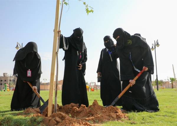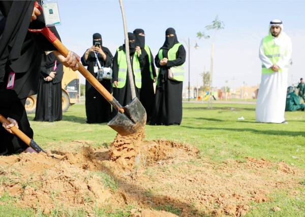 مشاركات يغرسن الأشجار في متنزه العزيزية.