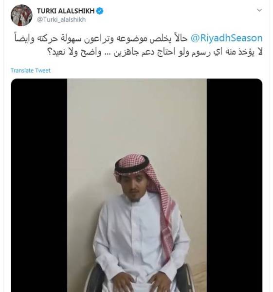 تفاعل سريعاً رئيس هيئة الترفيه تركي آل الشيخ مع معاناة شاب من ذوي الاحتياجات الخاصة يواجه صعوبة في الدخول بعربته «فود تراك» إلى مقر فعاليات «موسم الرياض».