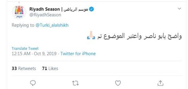 ومن خلال مقطع فيديو قال الشاب صالح العواجي: «أنا شاب من ذوي الإعاقة ولا أملك سوى عربة فود تراك أعول بها أسرتي، وأواجه صعوبات في الدخول إلى موسم الرياض، وحاولت مع المسؤولين من فعاليات الفرقة الكورية ولكن لا تزال الصعوبات قائمة، فجاء الرد من آل الشيخ عبر تغريدة في «تويتر» موجهاً المسؤولين عن موسم الرياض بحل مشكلته. وأضاف «حالاً يخلص موضوعه وتراعون سهولة حركته، ولا يؤخذ منه أي رسوم، ولو احتاج دعم جاهزين»، فيما وعد المسؤولين عن موسم الرياض بحل مشكلة العواجي.