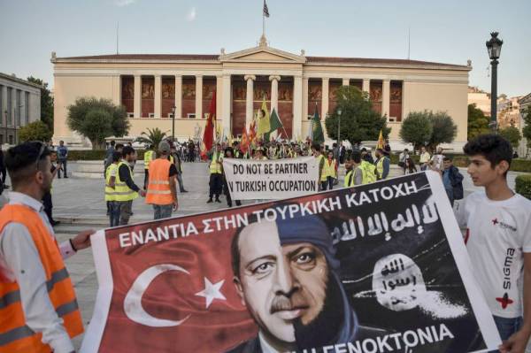 اكراد يتظاهرون امام السفارة التركية في اثينا احتجاجاً على العدوان أمس. (أ.ف.ب)