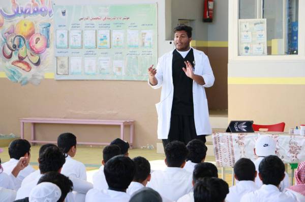 متطوع يوعي الطلاب بفحص مرض فقر الدم.