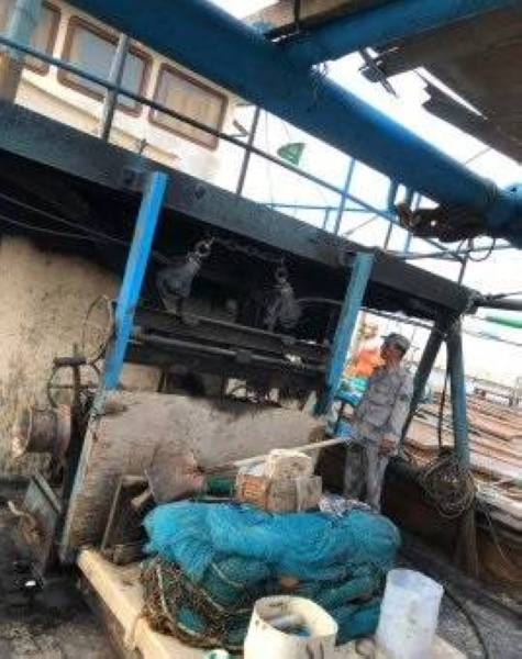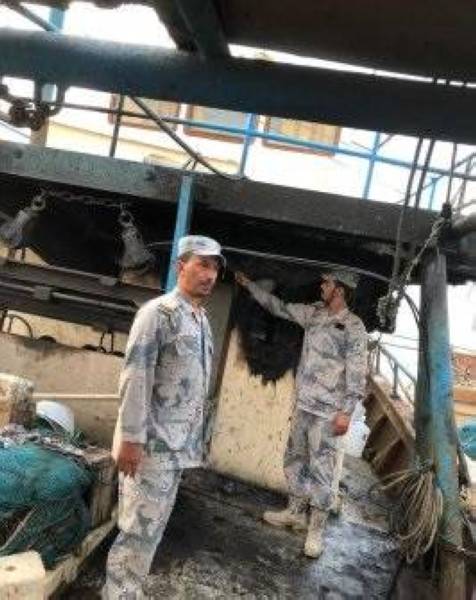 ونشر الحساب صوراً تُظهر قارب البحارة وقد تعرض لتلفيات جراء الحريق.