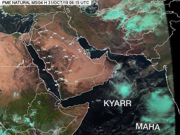 كشفت الهيئة العامة للأرصاد وحماية البيئة أن آخر المستجدات للحالة المدارية (كيار - KYARR) في بحر العرب تشير إلى انخفاض تصنيفها إلى «عاصفة مدارية»، وموقعها عند خط عرض 19.6 درجة شمالاً، وخط طول 62.6 درجة شرقاً، وتقدر سرعة الرياح حول مركزها (35-45) عقدة (65-83) كيلومترا/ساعة، وتتحرك باتجاه الغرب داخل بحر العرب بسرعة 5 عُقَد.