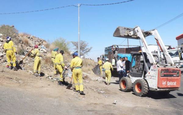 آليات وعمال أمانة عسير يزيلون آثار التشوه البصري بالمنطقة الصناعية بأبها. (عكاظ)