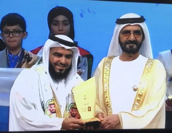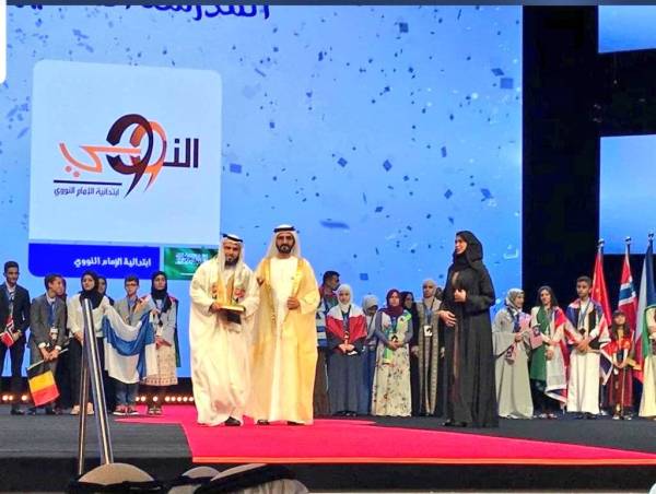 توّج نائب رئيس دولة الإمارات العربية المتحدة رئيس مجلس الوزراء وزير الدفاع حاكم إمارة دبي الشيخ محمد بن راشد آل مكتوم اليوم (الأربعاء)، مدرسة الإمام النووي الابتدائية التابعة لتعليم ينبع بالمركز الأول في مسابقة تحدي القراءة العربي، بعد منافسة مع 67 ألف مدرسة من 22 دولة، وتسلم الجائزة قائد المدرسة أحمد عسيري.