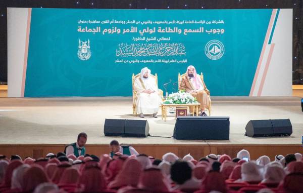 أكد الرئيس العام لهيئة الأمر بالمعروف والنهي عن المنكر الدكتور عبدالرحمن السند، أن الانحراف عن جماعة المسلمين وعدم تمحيص الشبه والمعتقدات المتطرفة مدعاة للفتنة، وتفكيك للحمة بين أفراد المجتمع، مشيرا إلى أن نصوص القرآن والسنة تؤكد وجوب طاعة ولي الأمر في المنشط والمكره، وأنه لا صلاح لحال الناس في أمر دينهم ودنياهم إلا بوجود الإمام واجتماعهم عليه. جاء ذلك خلال محاضرته العلمية بعنوان «وجوب السمع والطاعة لولي الأمر ولزوم الجماعة»، أمس (الخميس)، في جامعة أم القرى، بحضور مدير الجامعة الدكتور عبدالله بافيل، وعدد من وكلاء العمادات، وأعضاء هيئة التدريس، ومديري فروع الهيئة بمنطقة مكة المكرمة. وتحدث الدكتور السند عن أثر السمع والطاعة في تعزيز الأمن والاستقرار، وتوطيد معاني الانتماء واللحمة الوطنية، حاثاً على الالتفاف حول ولاة الأمر، ونبذ المناهج والأحزاب المتطرفة، مؤكدا أهمية الطاعة ولزوم الجماعة في تحقيق مصالح الناس، وحفظ حقوقهم، وإعانتهم على إقامة شرائع دينهم، ومحذراً من خطر التفرق والاختلاف في تشتيت أمر المسلمين وإضعاف صفهم. وأشار إلى ما تنعم به بلادنا من ولاية راشدة وحكيمة، تقوم على منهج الكتاب والسنة، وتقر الأمر بالمعروف والنهي عن المنكر، وتقمع البدع، وتدحض الخرافات، وتنشر المنهج الوسطي القويم، وتسعى لإعلاء كلمة الإسلام ووحدة صف المسلمين.