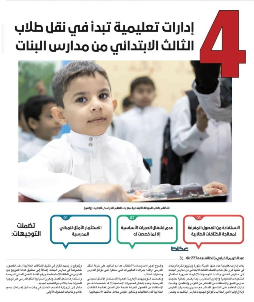 “Okaz” published on 6 Rabi' Al-Thani 1447, that several educational administrations began implementing similar steps by transferring third-grade elementary students from girls' schools to boys' schools.