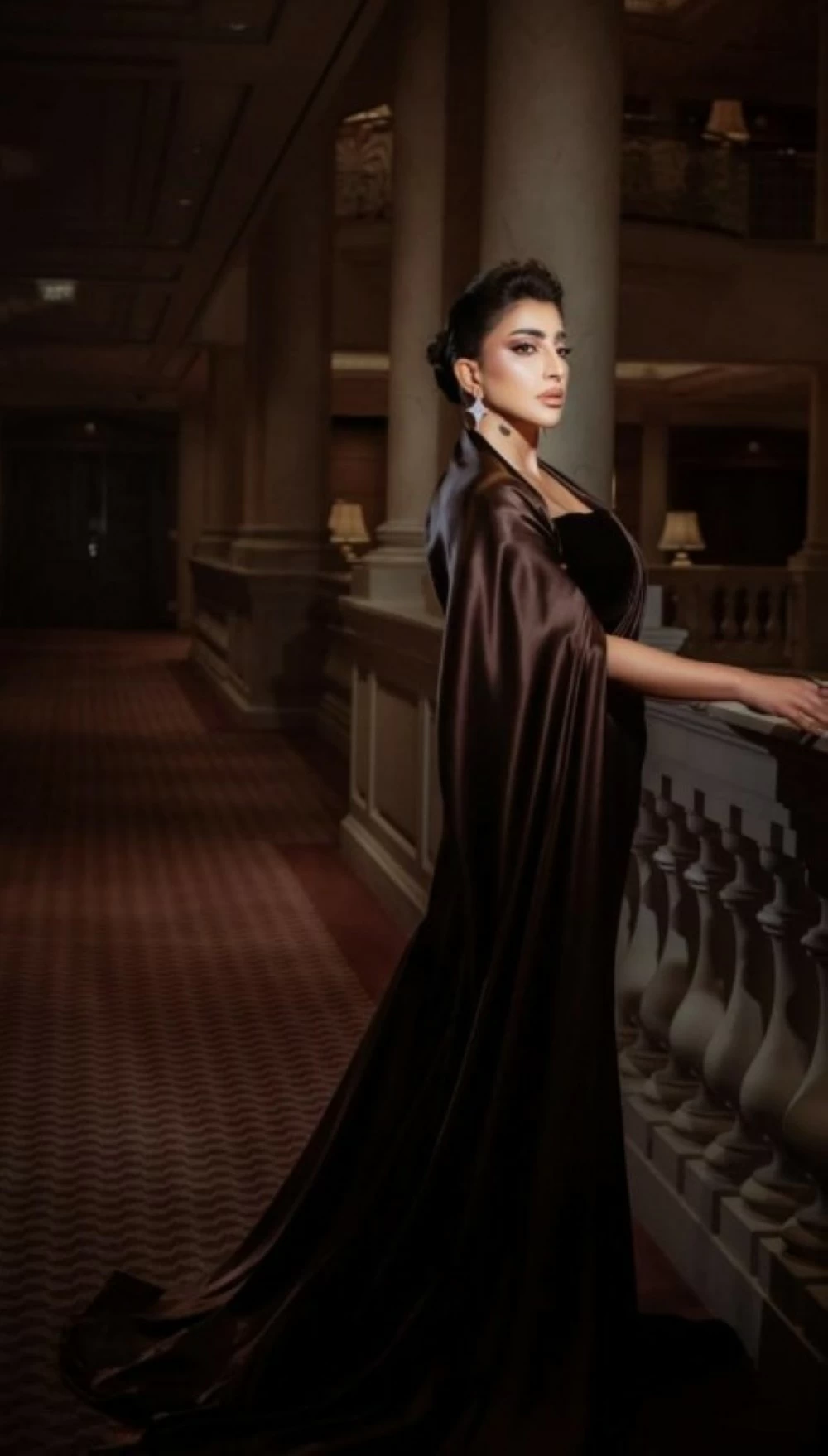 الإضاءة الهادئة أبرزت لمعان القماش وأغنت عمق اللون، بينما جاء المكياج الترابي والتسريحة المرفوعة ليكملا الأنوثة والقوة في الصورة.