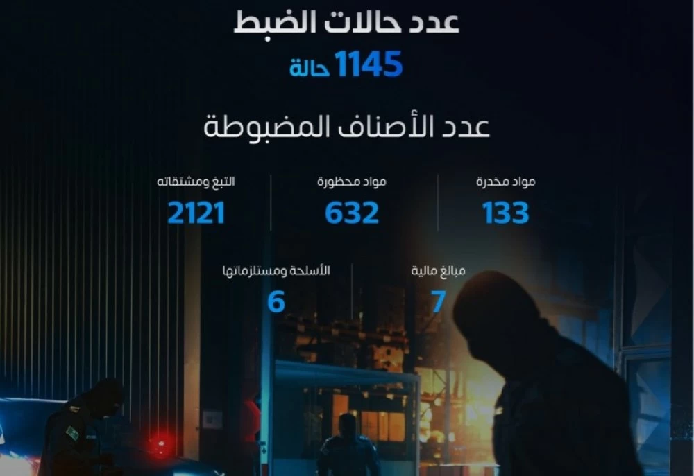 The Zakat, Tax and Customs Authority announced the seizure of 1,145 violations within a single week, as part of its ongoing efforts to protect community security and the national economy, and to combat smuggling attempts through various ports.