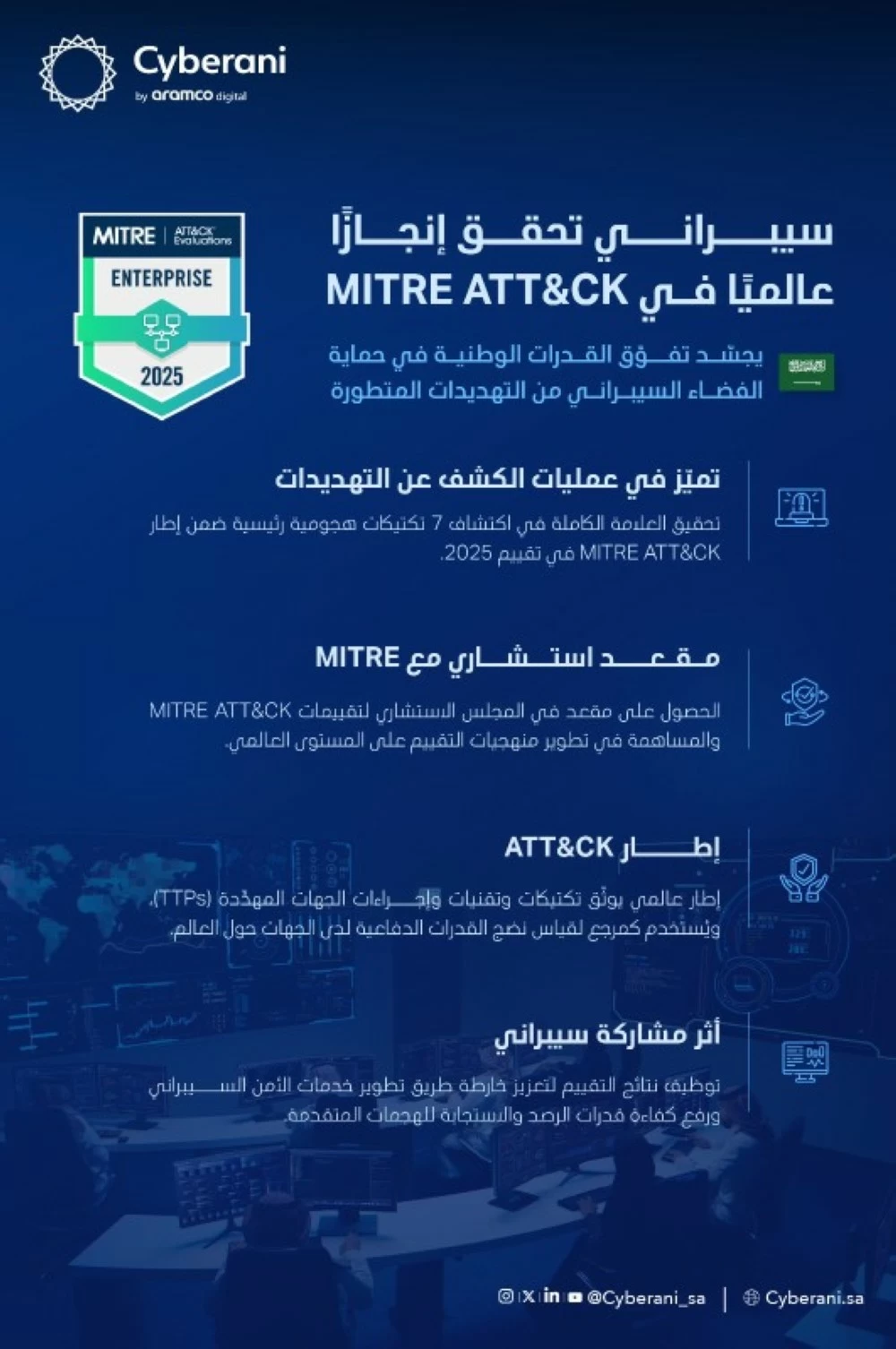 Cyberani, one of Aramco's digital companies specializing in cybersecurity services and solutions, announced a pioneering achievement in the MITRE ATT&CK evaluations for 2025, having successfully passed all cybersecurity tests applied to it and achieving exceptional results in detecting seven key offensive tactics within the MITRE ATT&CK framework, which are: 100% of information gathering techniques, 100% of credential access techniques,