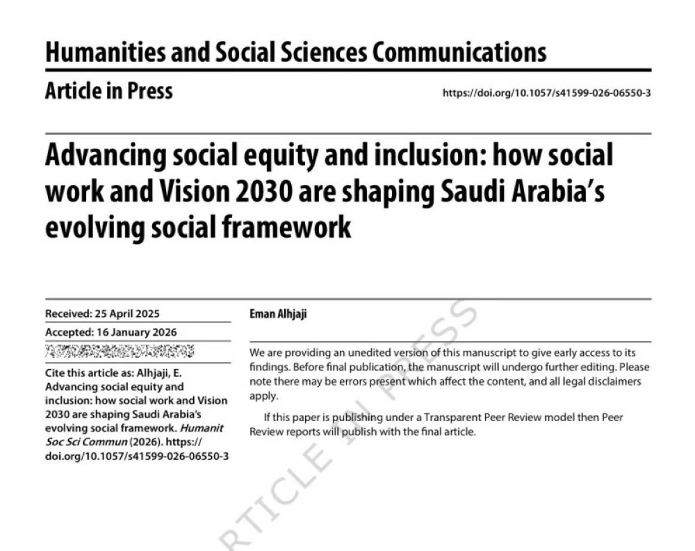 The study, titled "Enhancing Social Justice and Inclusion: How Social Work and Vision 2030 Shape the Evolving Social Framework in Saudi Arabia," provided an extensive analytical reading of social policies and government programs, and monitored their impact on women, people with disabilities, the elderly, and low-income families.