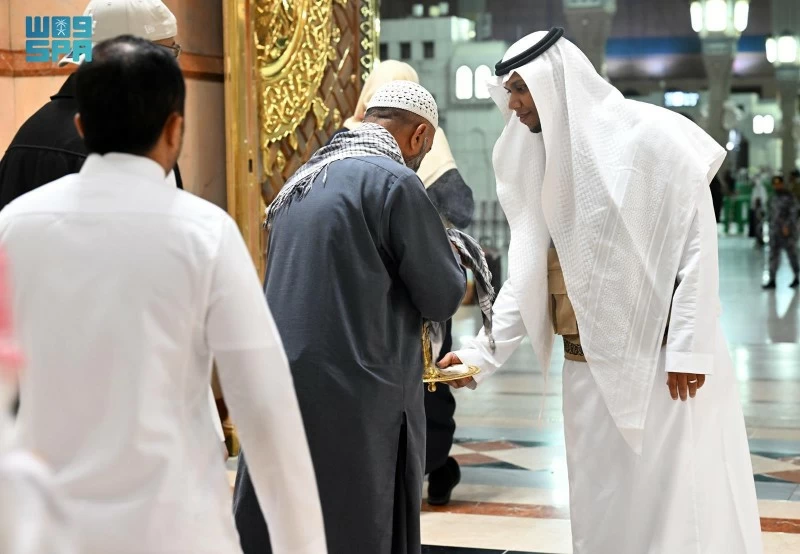 The perfumers roam the corridors and prayer areas of the mosque to perfume the visitors and worshippers, spreading the fragrance of oud and the aroma of incense throughout the mosque, in a scene that overflows with tranquility and reflects the level of care and attention given to those who visit the Prophet's Mosque.