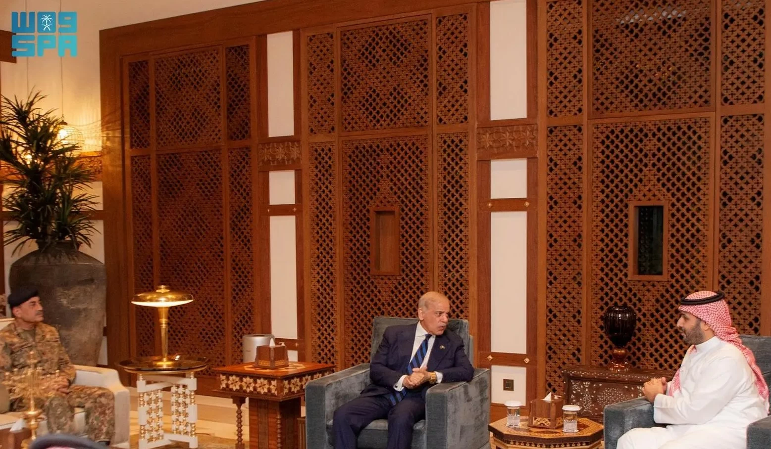 فيما حضر من الجانب الباكستاني نائب رئيس الوزراء وزير الخارجية محمد إسحاق دار، وقائد قوات الدفاع رئيس أركان الجيش الباكستاني المشير ركن سيد عاصم منير.