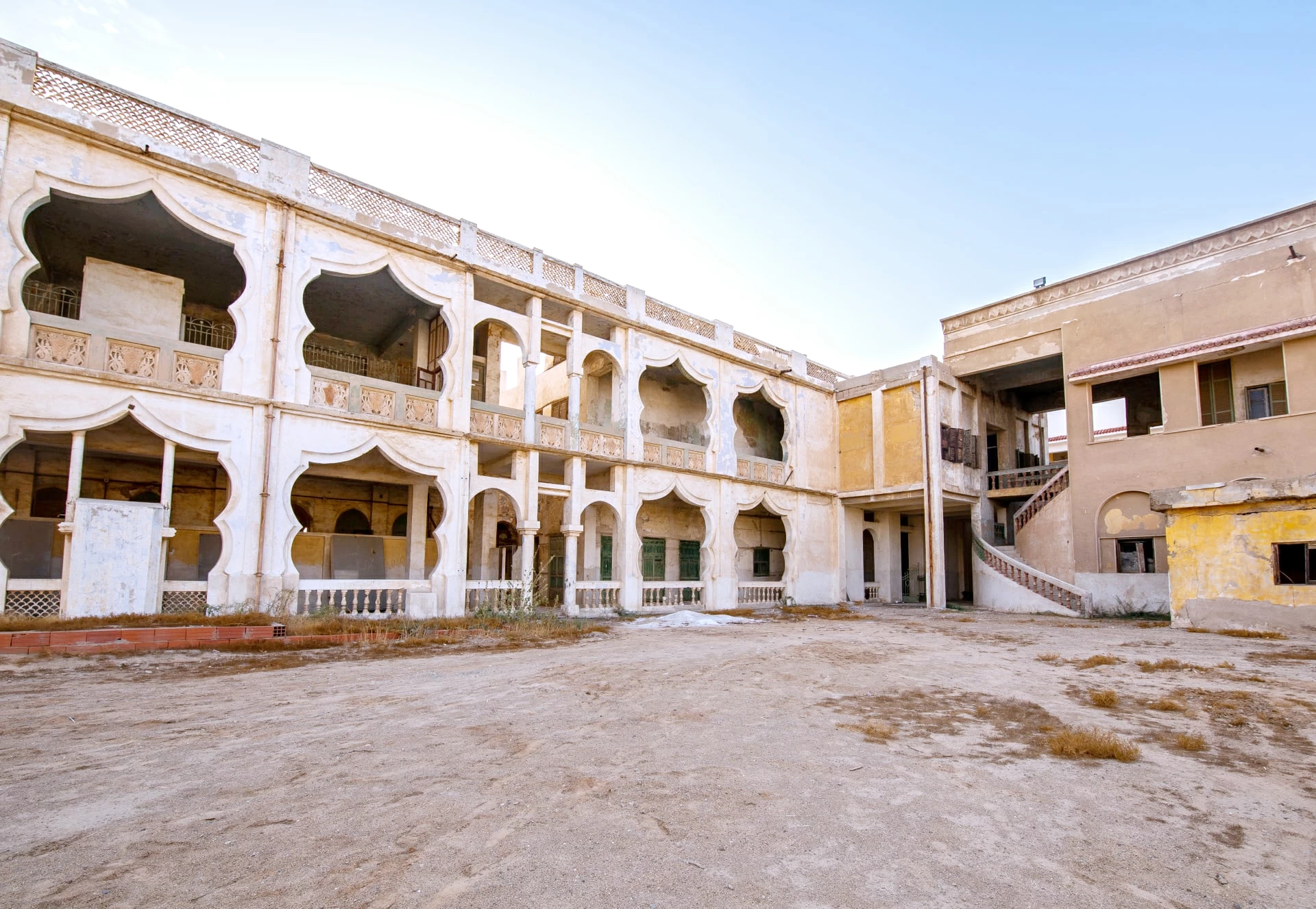 It includes three facades: the southern facade overlooks the Al-Nazlah Al-Yamaniyah neighborhood, the northern facade overlooks the Eid prayer area, and the western facade overlooks the Al-Sabeel area. It consists of two floors and annexes on the southern and western sides, surrounded by a wall approximately three meters high.