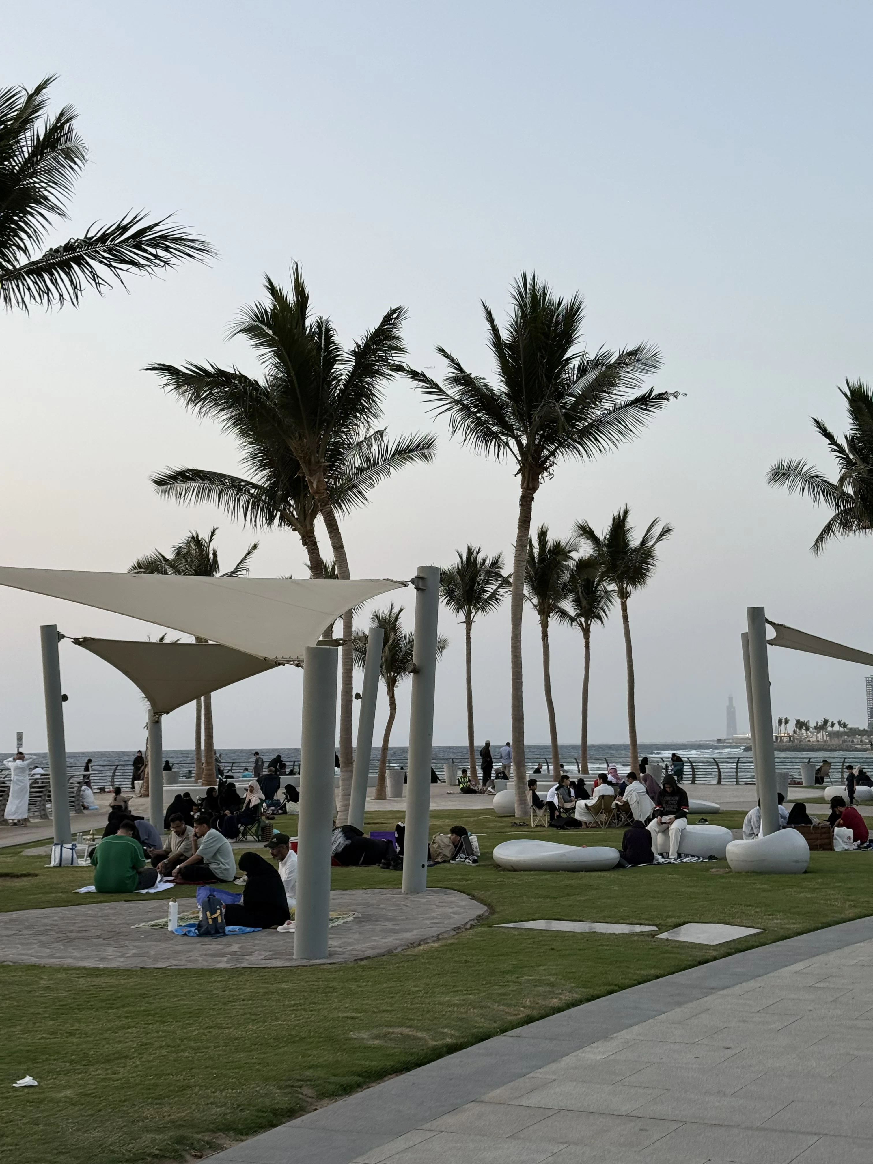 Many fasting individuals prefer to break their fast on the shores of Jeddah's Corniche, which witnesses a large influx of families, visitors, and pilgrims who favor breaking their fast by the waterfront. The Corniche is adorned with Ramadan decorations that add an aesthetic touch, attracting attention along the pedestrian walkway by the seaside.