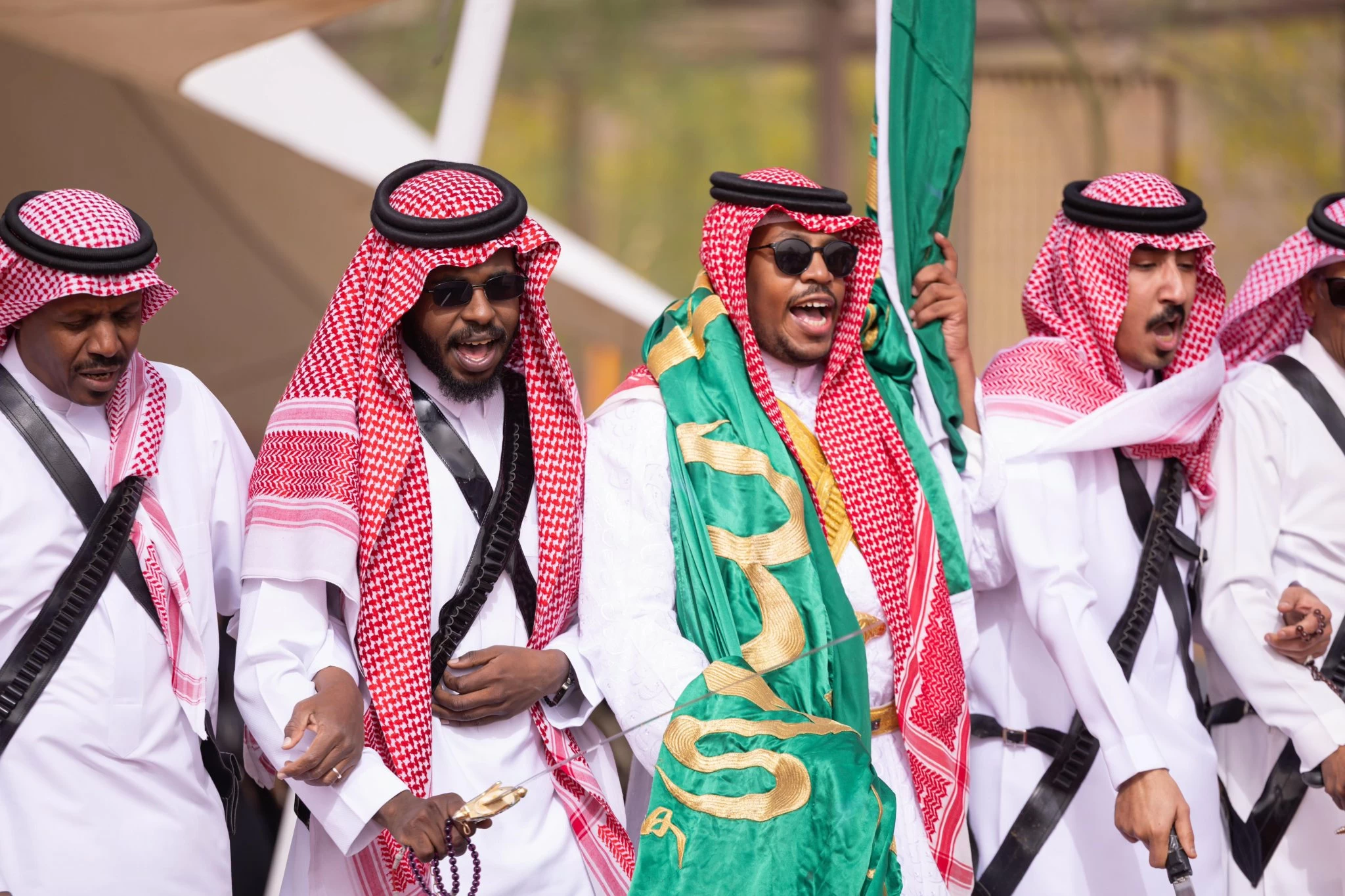At the gathering sites, the rows align in an organized scene, steps swaying to the rhythm of the drums, and flags rise in a tableau that reflects the strength of social bonds and the extension of popular heritage in the details of Eid. Participants advance in their traditional attire, between the bisht and the thobe, in a visual presence that matches the power of sound and performance.
