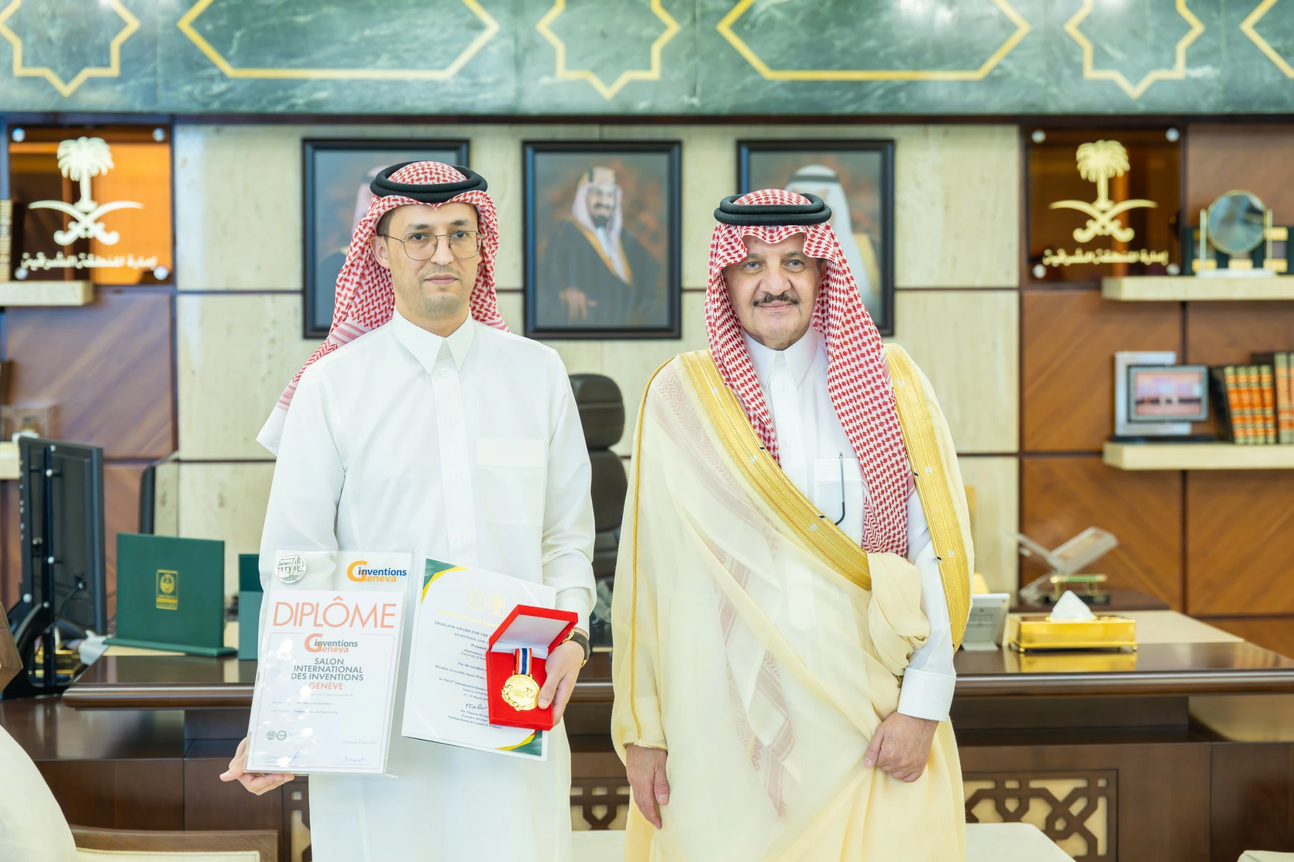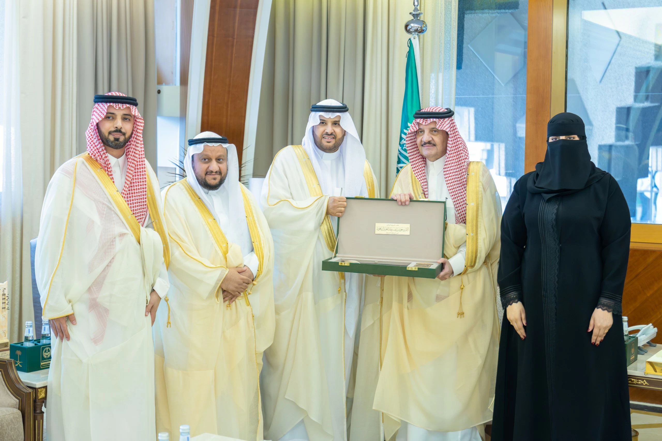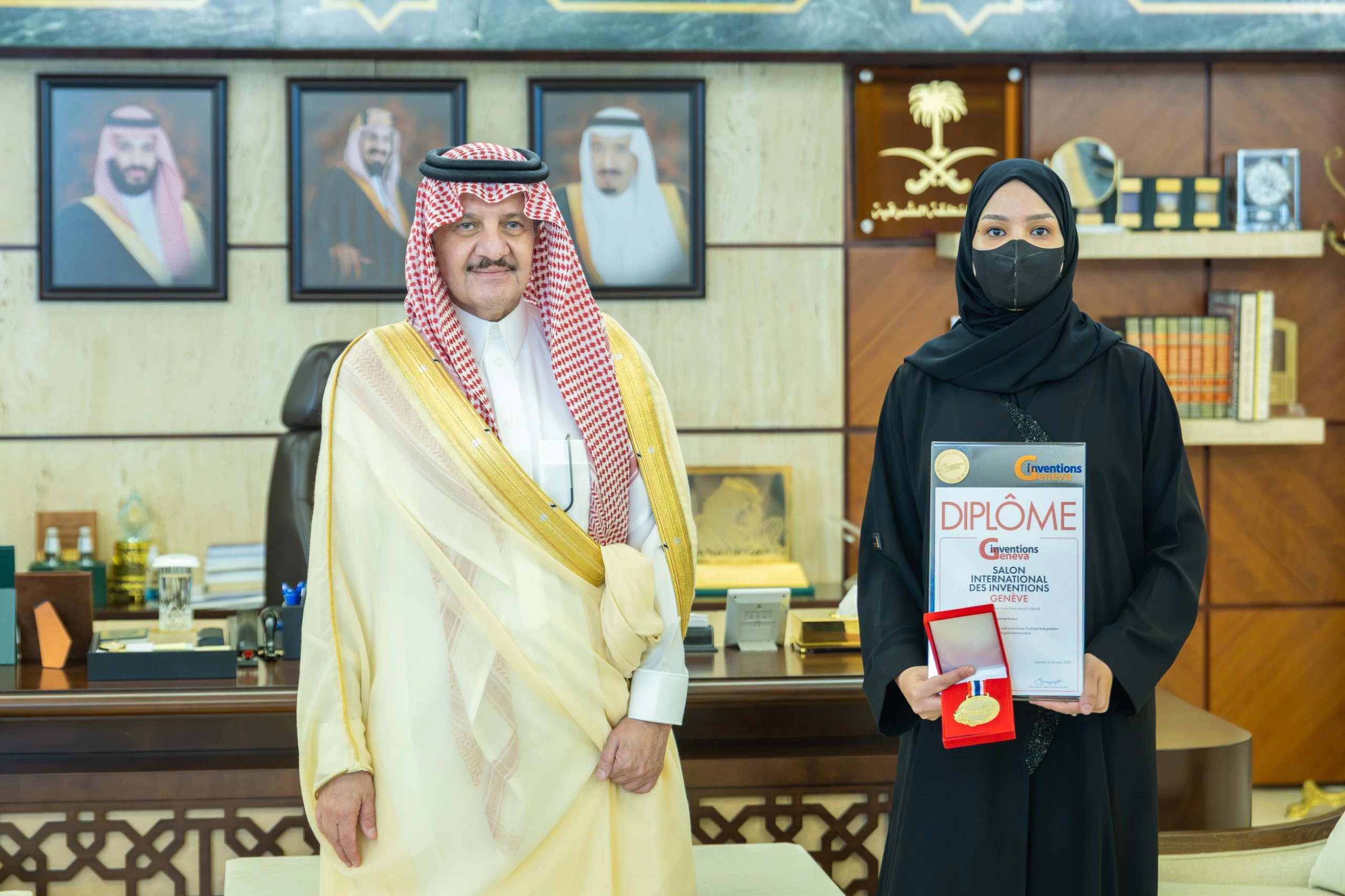 The Prince of the Eastern Province, Prince Saud bin Naif bin Abdulaziz, received today (Sunday) in his office at the Emirate's Diwan the President of Hafr Al-Batin University, Dr. Khalid bin Bani Al-Harbi, in the presence of the university's Vice President for Graduate Studies and Scientific Research, Dr. Badr bin Jumaan Al-Shaari, along with several university leaders, accompanied by the winners of the Geneva International Exhibition of Inventions 2026: Dr. Najood bint Mohammed Badawi, Dr. Abdulrahman bin Darbash Al-Zahrani, and student Salman bin Haif Al-Mutairi.