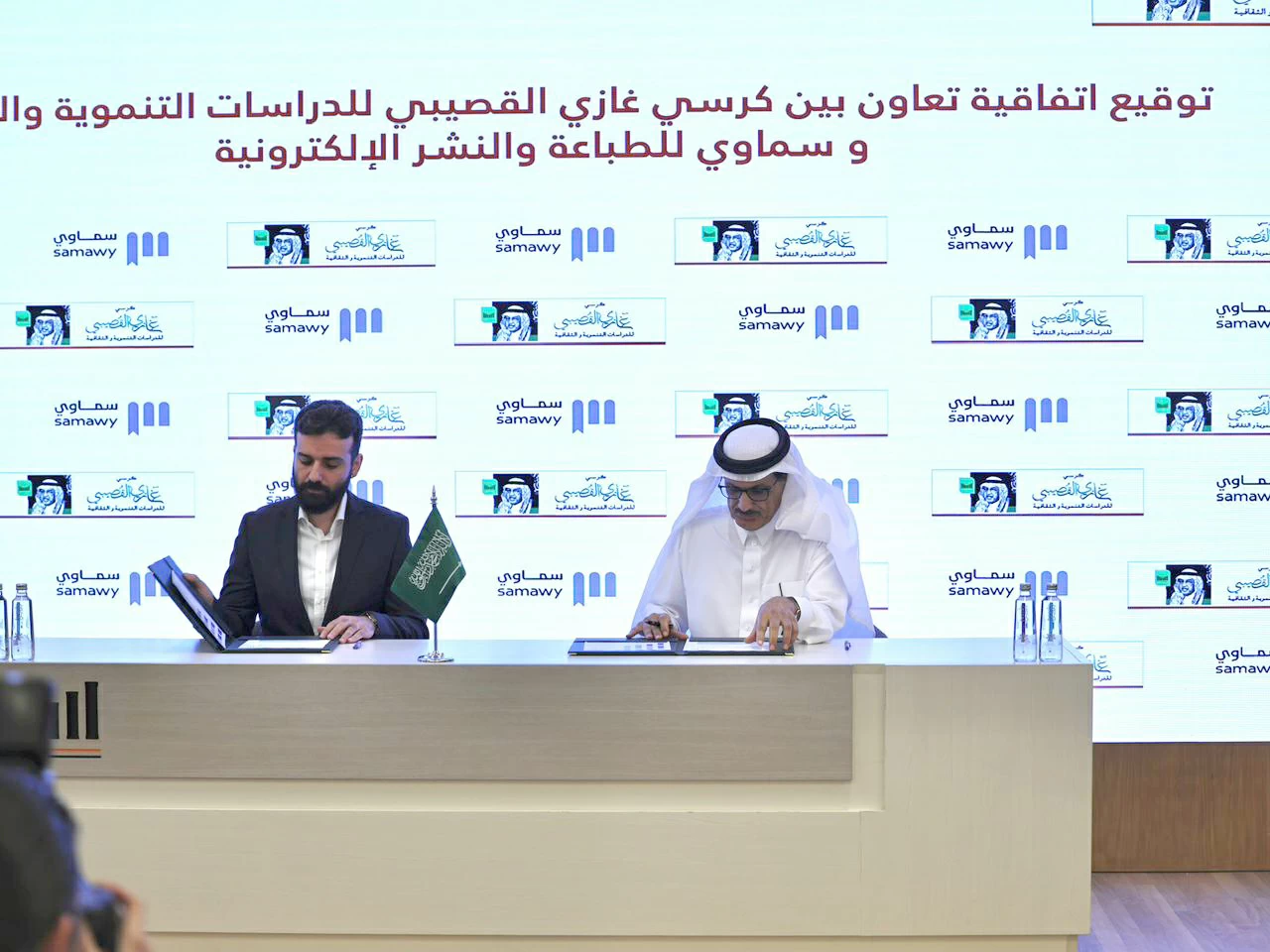 The Ghazi Al-Qusaibi Chair for Developmental and Cultural Studies at Al-Yamamah University signed a cooperation agreement with the Samawi platform for the scientific, cultural printing, publishing, and distribution of its publications through electronic, paper, and audio channels, contributing to the enhancement and sustainability of knowledge content dissemination.