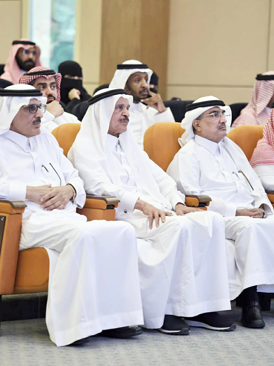The ceremony featured a poem by the late Ghazi Al-Qusaibi recited by student Abdulaziz Al-Shaibi, alongside the presence of several members of the chair's supervisory committee, including consultant engineer Osama Al-Zamil, Khalid Al-Malik, Ziyad Al-Drees, and Dr. Omar Al-Saif, in addition to members of the scientific committee and several university professors.