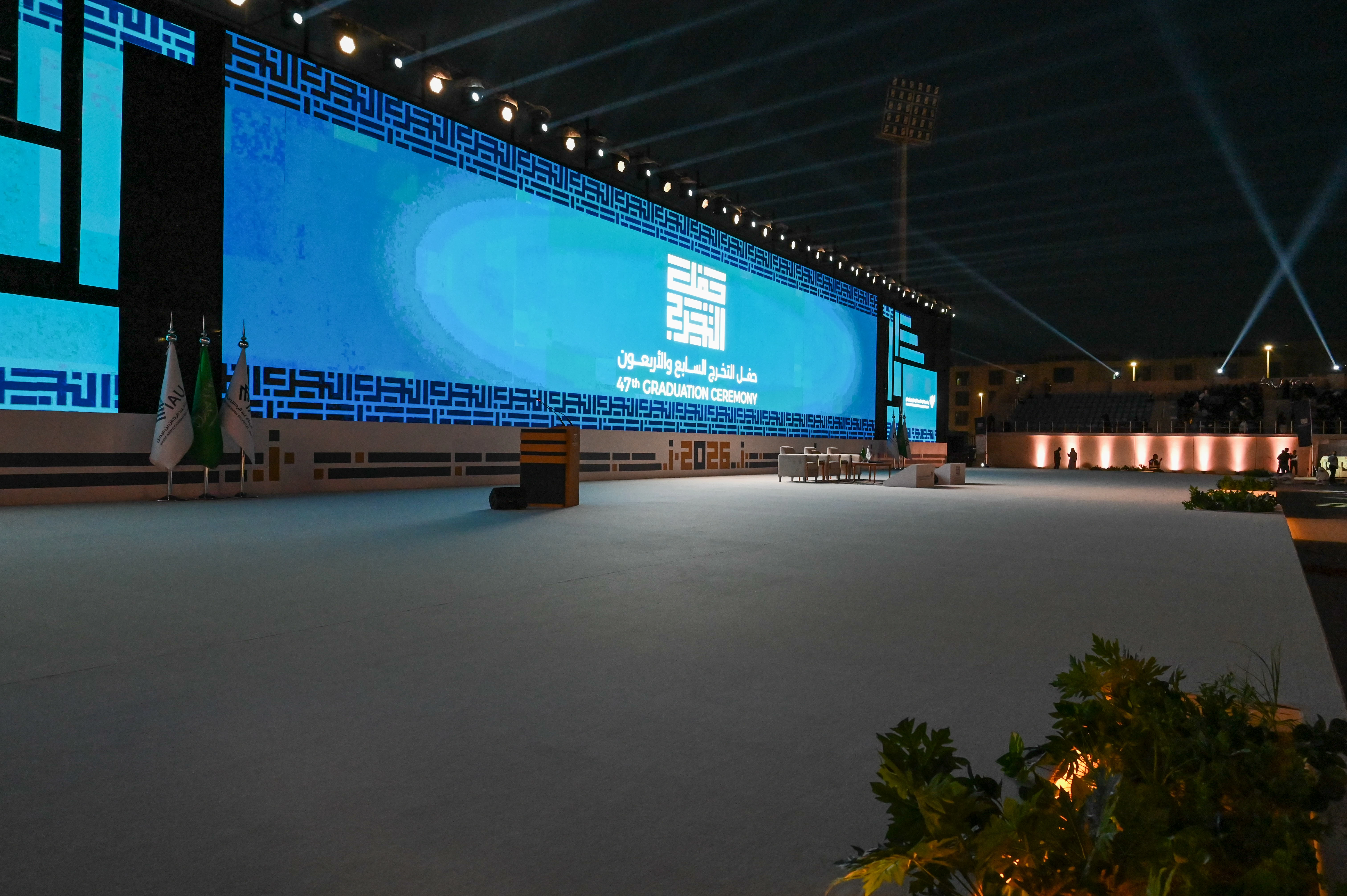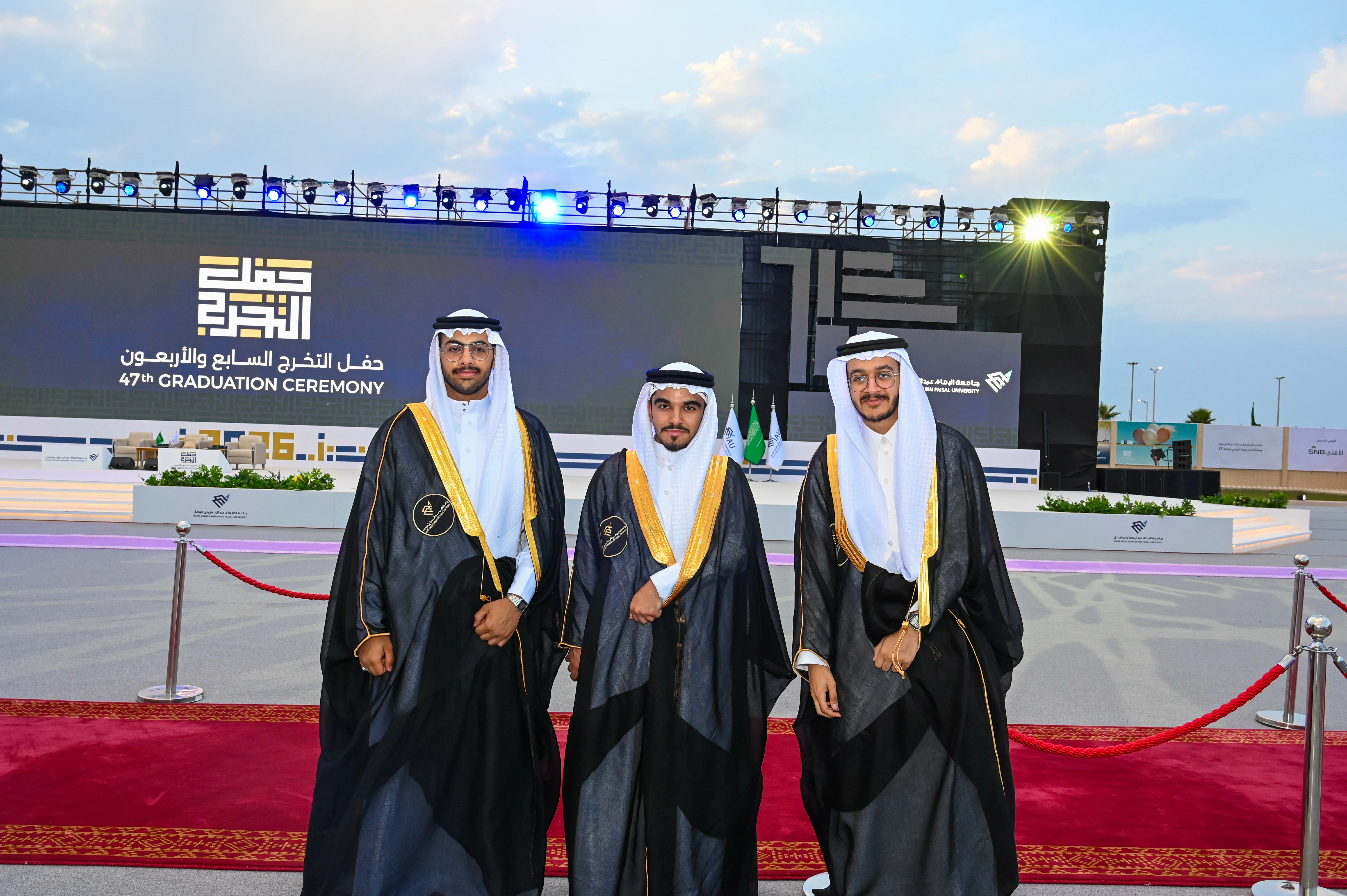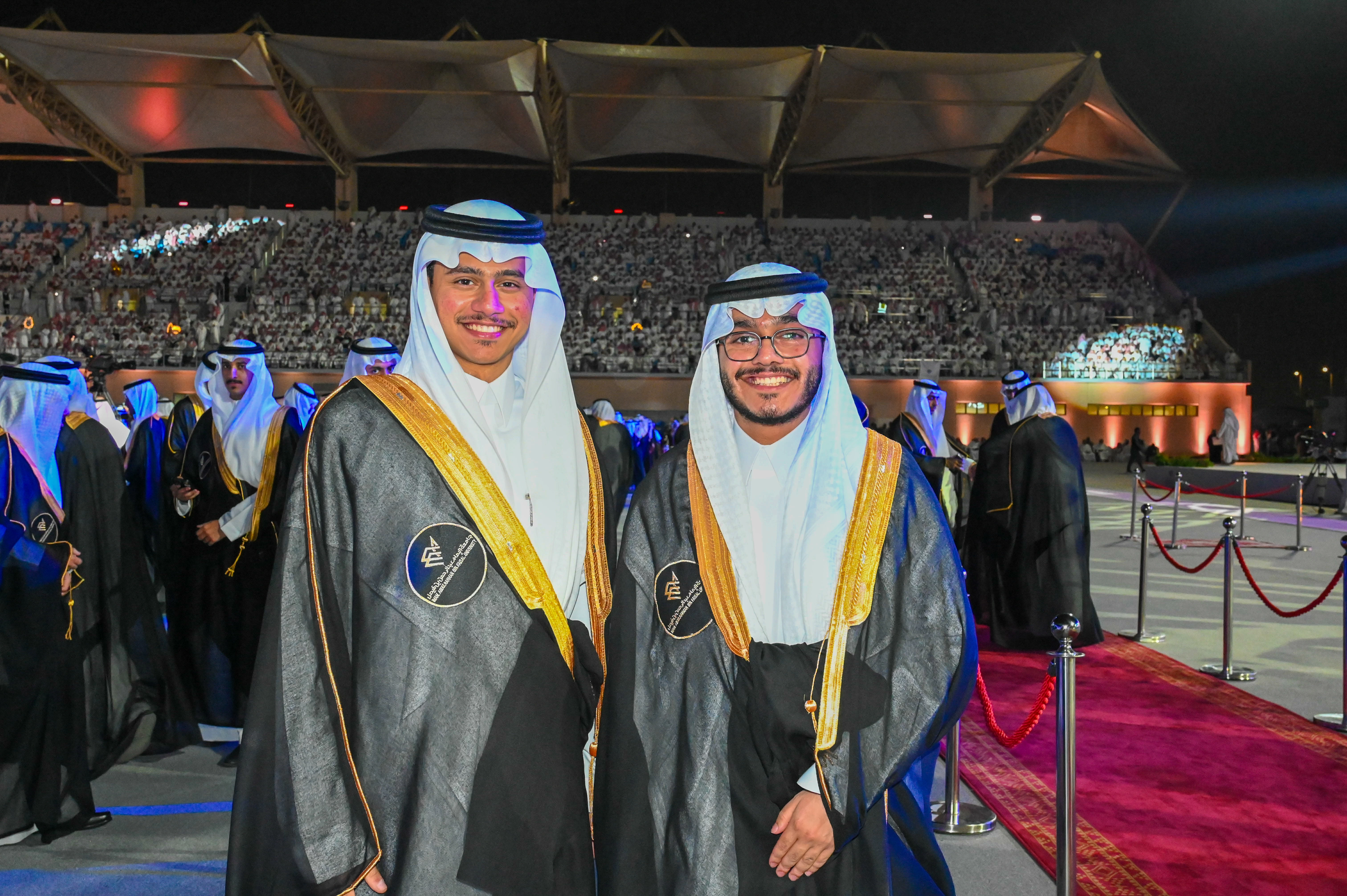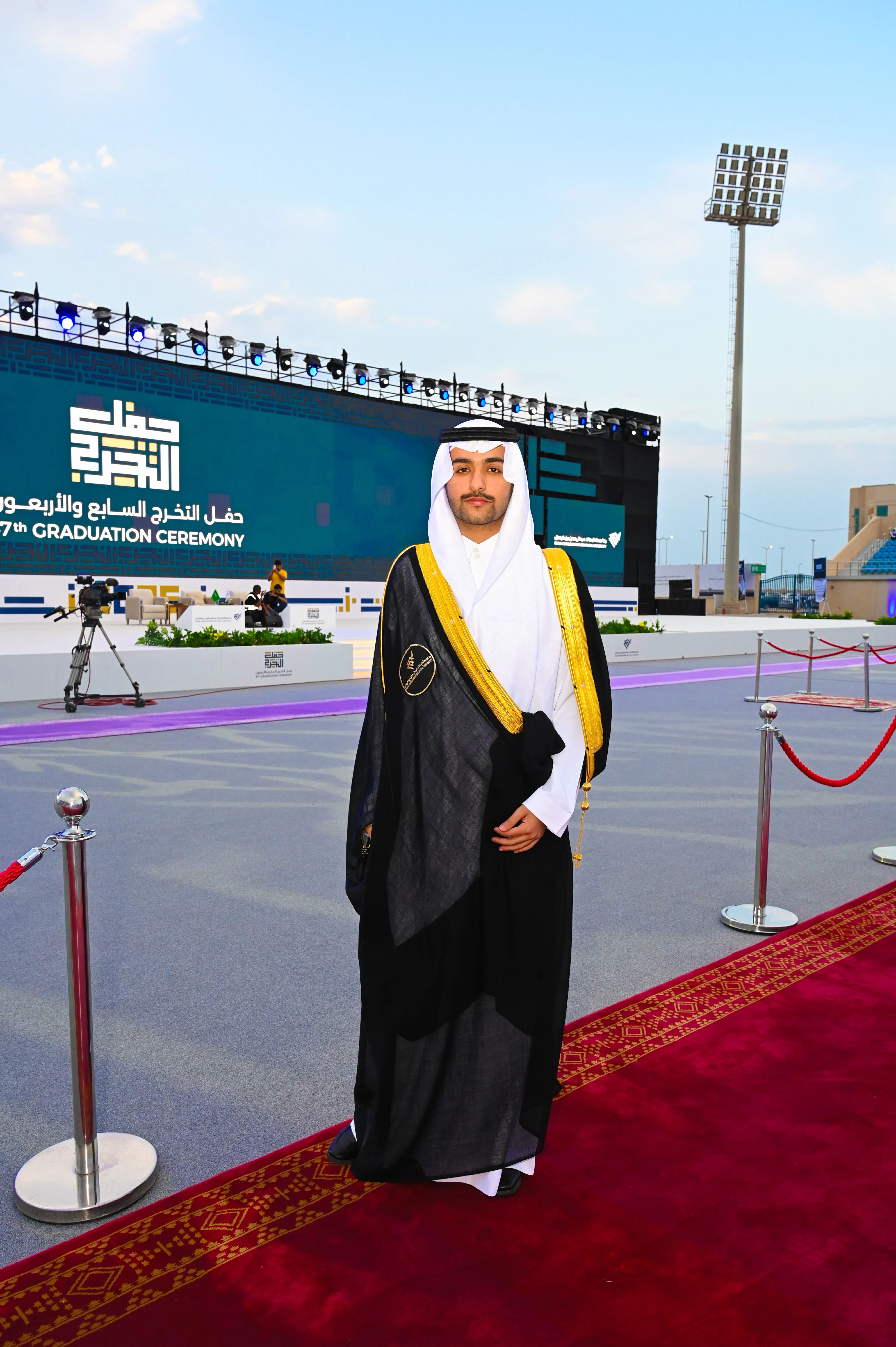 A Great Responsibility and an Ambitious JourneyThe graduation ceremony began with the national anthem, followed by the academic procession, a recitation from the Holy Quran, and a speech by the graduates delivered by the student (graduate) Badr bin Saad Sulaib Al-Otaibi (from the College of Business Administration), in which he said: "Today, we embark towards the future with firm values, all of us aware that what we carry is a great responsibility towards our country, to provide our generous homeland with mature knowledge and an awareness that comprehends the present and anticipates the future, responding to some of the favor of our homeland with determination and sincerity, through work that is accomplished, and effort that bears fruit, contributing to its ambitious journey and preserving its trust, under our wise leadership."
