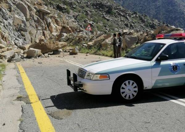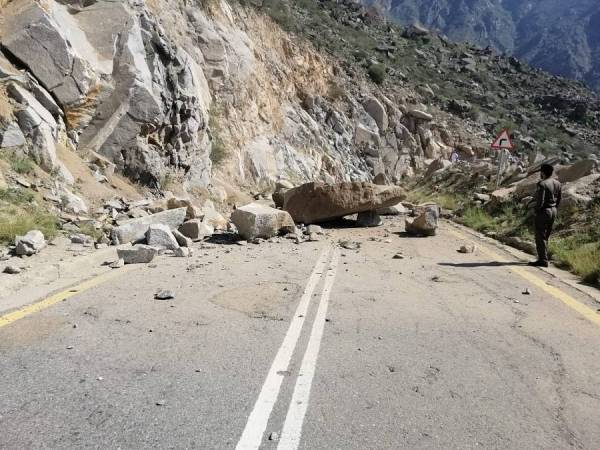 وباشرت المعدات والآليات التابعة لفرق الصيانة العمل على إزالة الصخور والأتربة من العقبة أمام مستخدمي.
