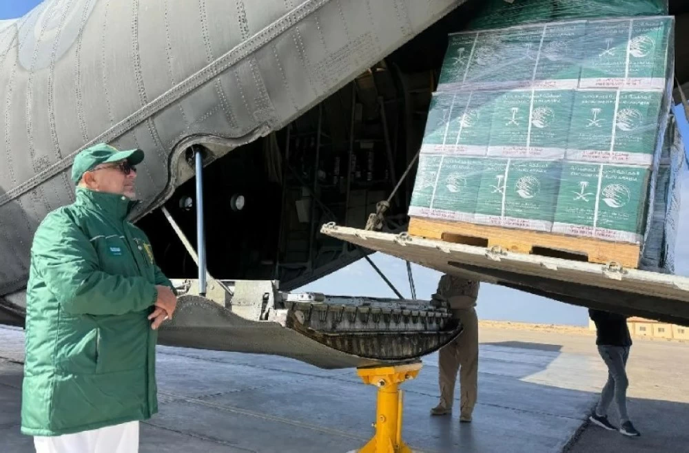 The Saudi relief plane number (77) arrived today at Al-Arish International Airport in the Arab Republic of Egypt, operated by the King Salman Humanitarian Aid and Relief Center, in coordination with the Ministry of Defense and the Kingdom's Embassy in Cairo.