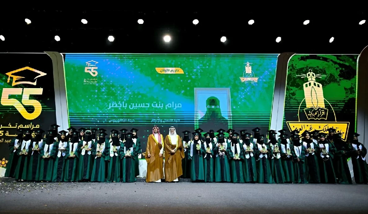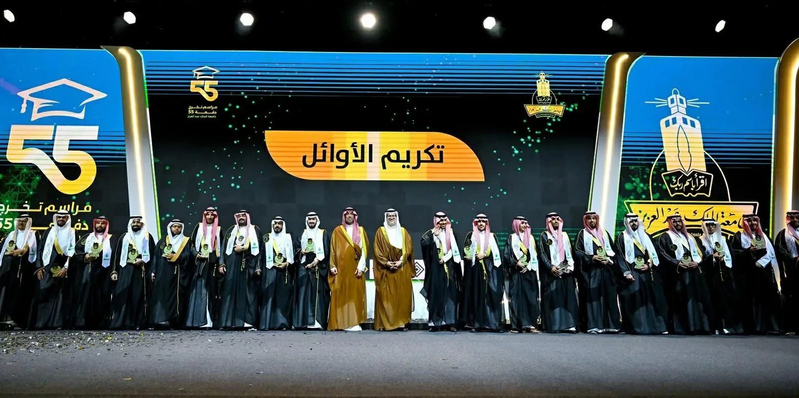 تحت رعاية مستشار خادم الحرمين الشريفين أمير منطقة مكة المكرمة الأمير خالد بن فيصل بن عبدالعزيز، ونيابةً عن نائب أمير منطقة مكة المكرمة الأمير سعود بن مشعل بن عبدالعزيز، شهد مُحافظ جدة الأمير سعود بن عبدالله بن جلوي اليوم، حفل تخريج الدفعة الـ55 من طلاب وطالبات جامعة الملك عبدالعزيز، البالغ عددهم (24039) طالباً وطالبة في مختلف التخصصات، بمركز الملك فيصل للمؤتمرات، بحضور رئيس جامعة الملك عبدالعزيز الدكتور طريف بن يوسف الأعمى، وعدد من القيادات الأكاديمية وعمداء الكليات وأولياء أمور الخريجين والخريجات.