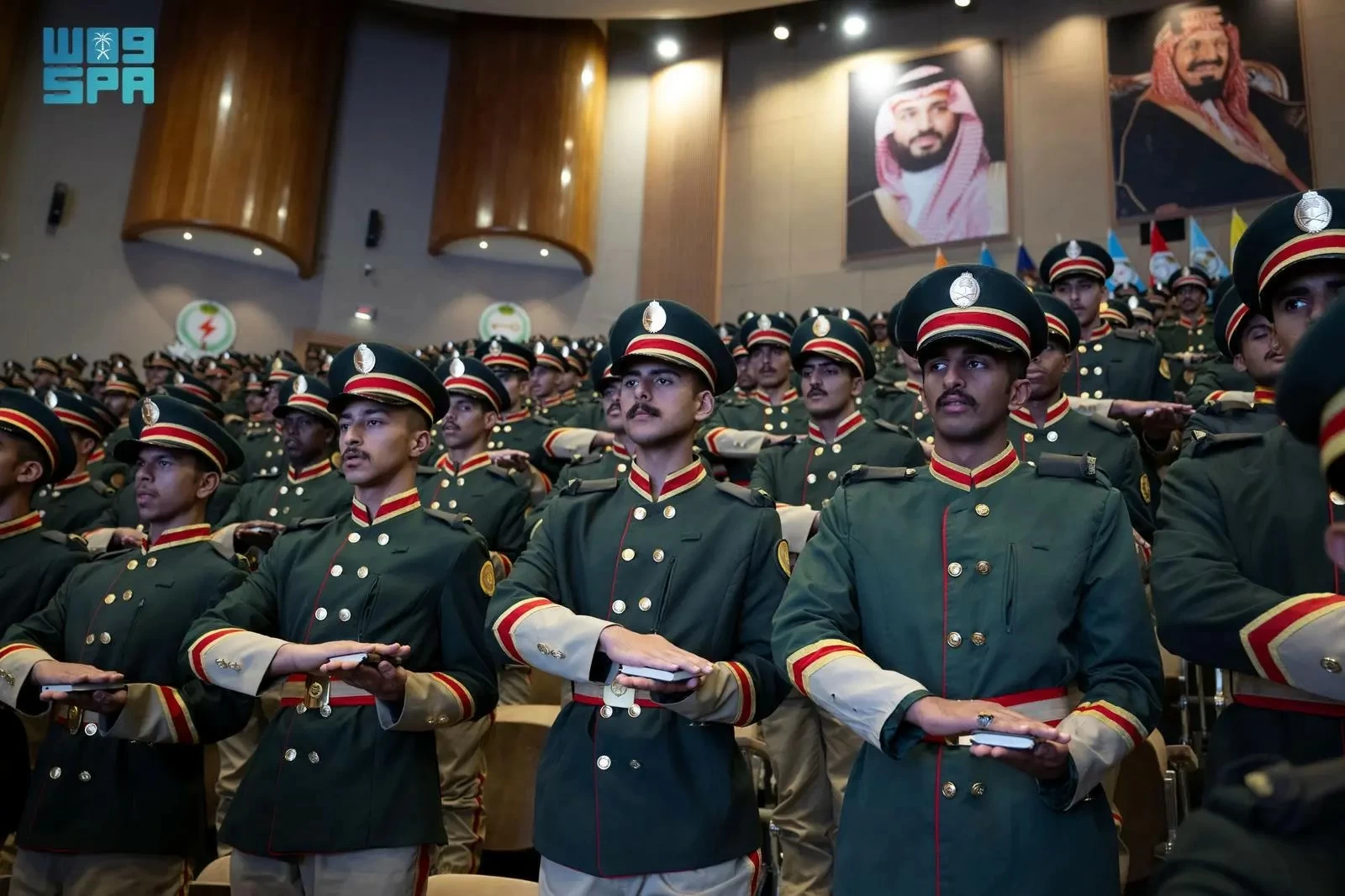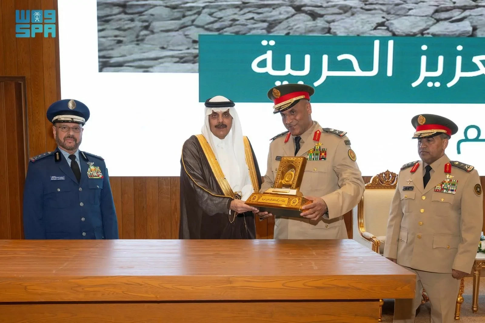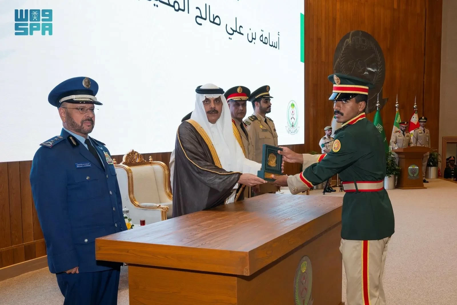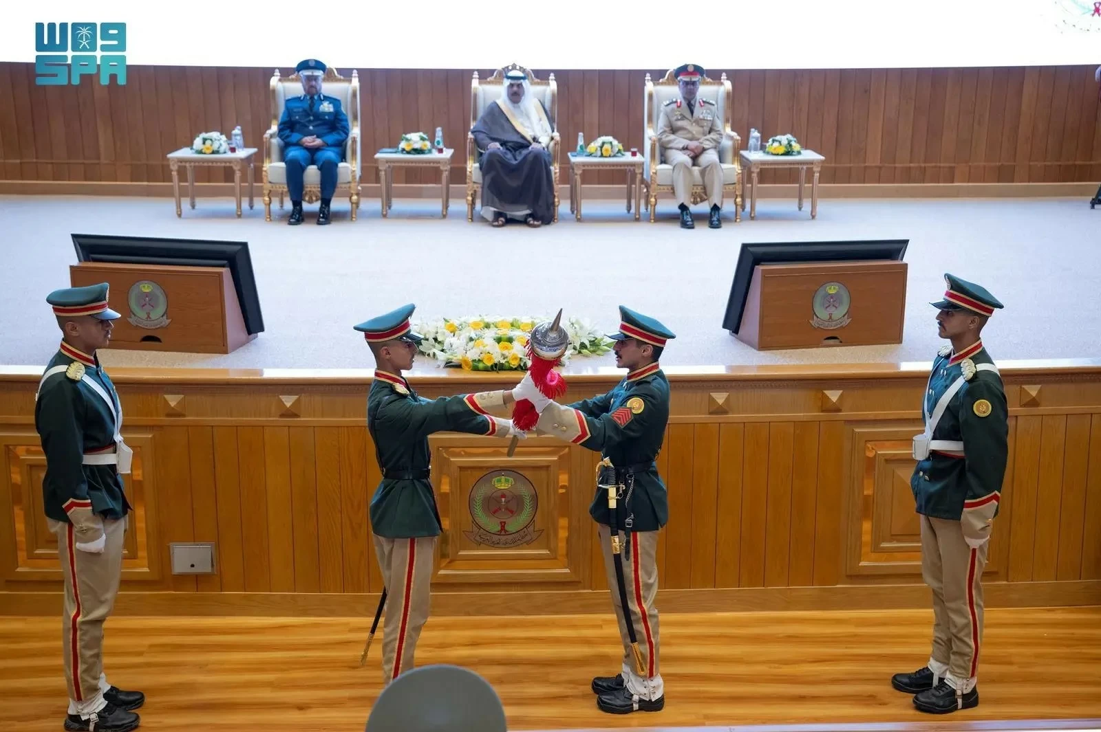 Upon his arrival at the academy in Al-Uyaynah, he was received by the Chief of General Staff, Lieutenant General Fayad bin Hamid Al-Ruwaili, the Chief of Ground Forces, Lieutenant General Fahd bin Saud Al-Jahni, and the Commander of King Abdulaziz Military Academy, Major General Fahd bin Saad Al-Qahiz.