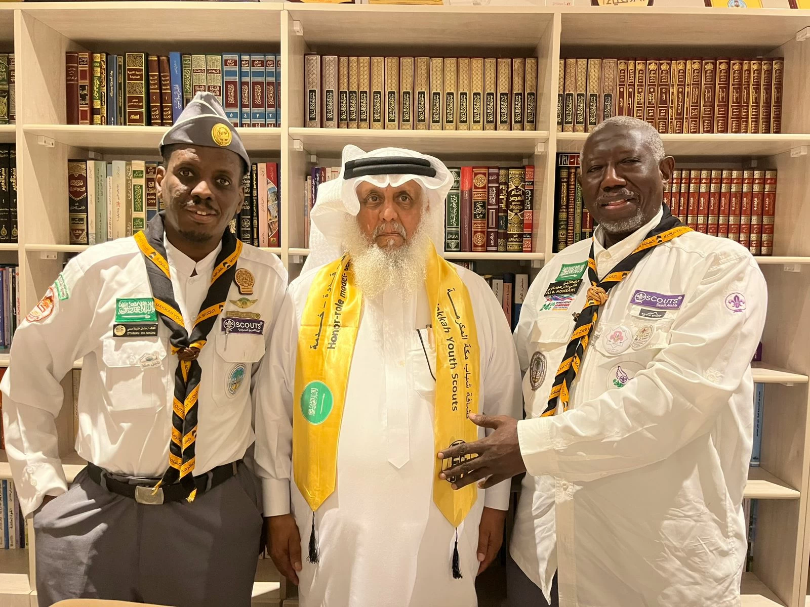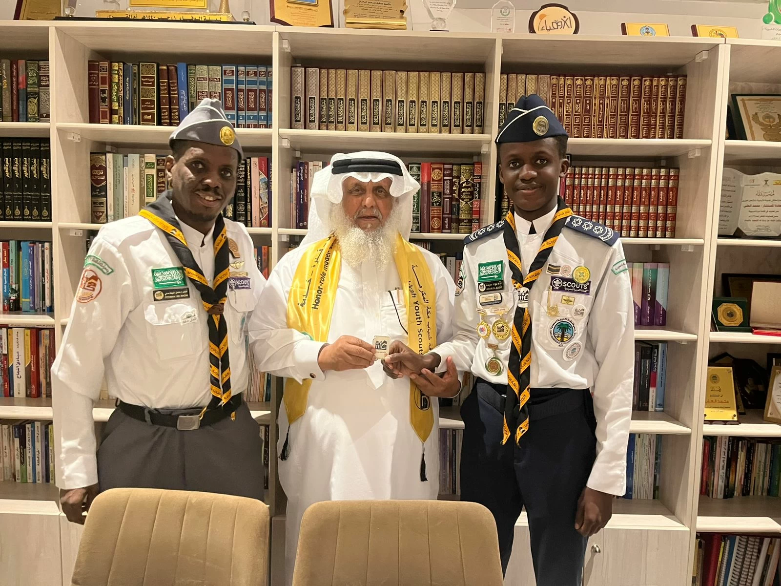 At the end of the visit, Scout Leader Ali Bakr Hawsawi presented him with the new scouting scarf for the Youth Scouts team of Makkah, while he received a commemorative medal from Rover Crew Leader Adam Abdu Abubakar of the Youth Scouts of Makkah.