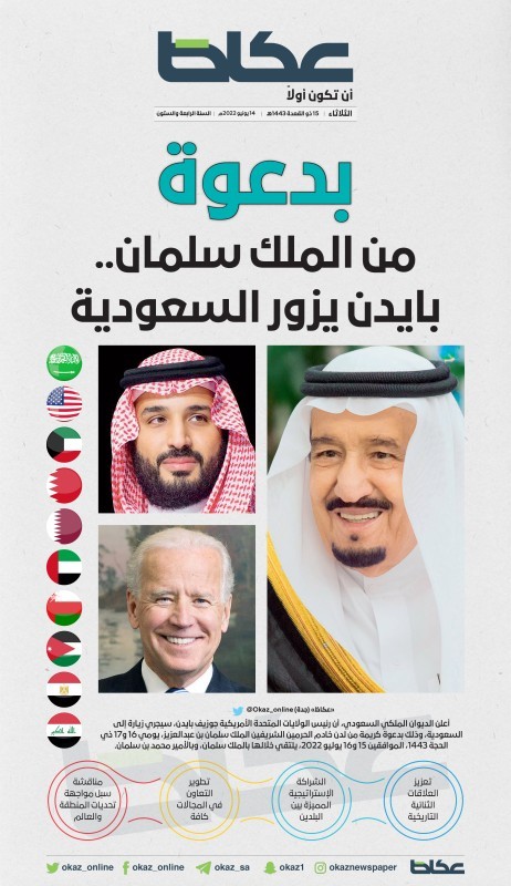 أعلن الديوان الملكي السعودي، أن رئيس الولايات المتحدة الأمريكية جوزيف بايدن، سيجري زيارة إلى السعودية، وذلك بدعوة كريمة من لدن خادم الحرمين الشريفين الملك سلمان بن عبدالعزيز، يومي 16 و17 ذي الحجة 1443، الموافقين 15 و16 يوليو 2022، يلتقي خلالها بالملك سلمان، وبالأمير محمد بن سلمان.