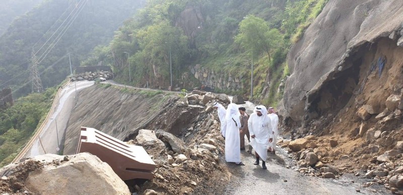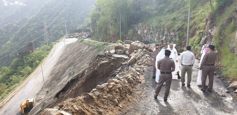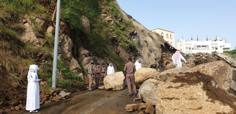 وتفقد المحافظ عدداً من المواقع المتضررة على الطريق، من أبرزها سقوط صخرة كبيرة جدا بعد منتصف ليل أمس على نفس الطريق قبل مدخل محكمة فيفاء أدى إلى تضرر الطريق والمصدات.
