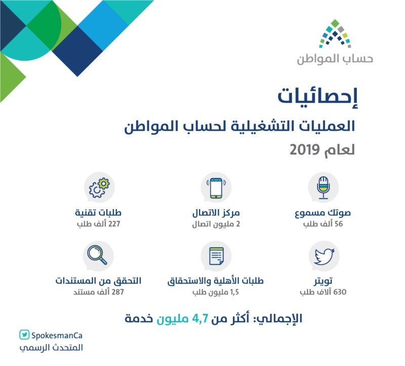 نجح برنامج حساب المواطن بالتعامل مع أكثر من 4.7 مليون خدمة في عام 2019 على جميع منصاته الممثلة في «صوتك مسموع» و«مركز الاتصال» و«حساب خدمة المستفيدين» و«الحساب الرسمي للبرنامج» وحساب المتحدث الرسمي على منصة التواصل الاجتماعي «تويتر»، إضافة إلى مراجعة وتدقيق المستندات التي تم التحقق منها والطلبات التقنية والاعتراضات.
