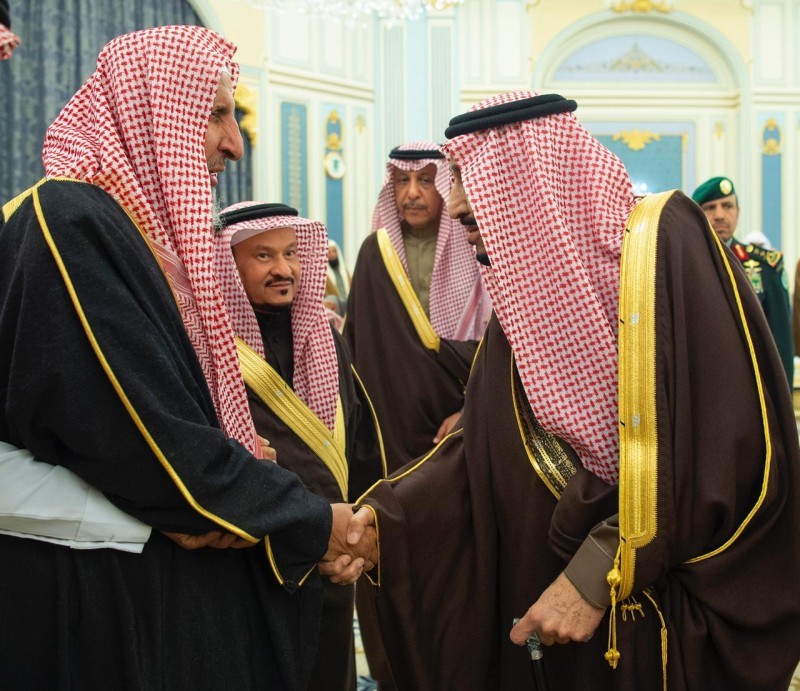 وفي بداية الاستقبال، أنصت الجميع لتلاوة آيات من القرآن الكريم، ثم تشرف الحضور بالسلام على خادم الحرمين الشريفين.