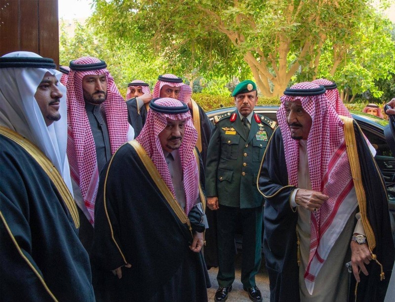 ولدى وصول خادم الحرمين الشريفين، كان في استقباله أمير منطقة الرياض الأمير فيصل بن بندر بن عبدالعزيز، وولي العهد نائب رئيس مجلس الوزراء وزير الدفاع الأمير محمد بن سلمان بن عبدالعزيز، ووزير الدولة عضو مجلس الوزراء الأمير تركي بن محمد بن فهد بن عبدالعزيز، ونائب أمير منطقة الرياض الأمير محمد بن عبدالرحمن بن عبدالعزيز، ووزير الداخلية الأمير عبدالعزيز بن سعود بن نايف بن عبدالعزيز، ووزير الحرس الوطني الأمير عبدالله بن بندر بن عبدالعزيز.
