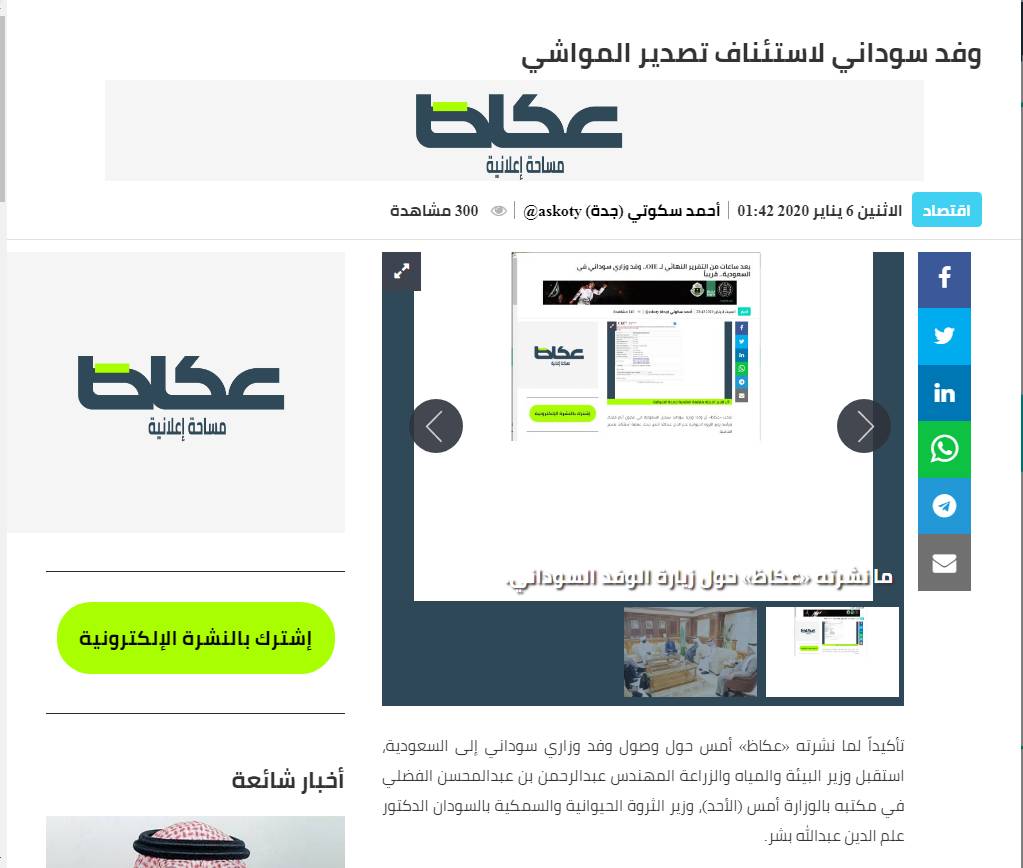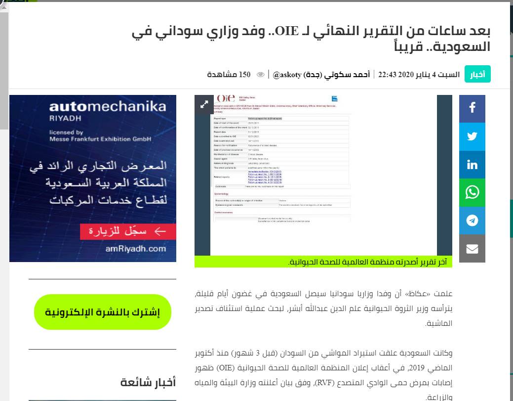 وكانت «عكاظ» نشرت في 6 يناير الجاري، وصول وزير الثروة الحيوانية والسمكية بالسودان الدكتور علم الدين عبدالله بشر، إلى السعودية، ولقاءه وزير البيئة والمياه والزراعة المهندس عبدالرحمن بن عبدالمحسن الفضلي، ومناقشة الاهتمام المشترك بين البلدين في مجالي الثروة الحيوانية والسمكية. وكانت المصادر أكدت لـ«عكاظ» أن الوفد السوداني يبحث عملية استئناف تصدير المواشي للسعودية الذي تم تعليقه (قبل 3 شهور) منذ شهر أكتوبر الماضي، في أعقاب إعلان المنظمة العالمية للصحة الحيوانية (OIE) ظهور إصابات بمرض حمى الوادي المتصدع (RVF)، وفق بيان أعلنته وزارة البيئة والمياه والزراعة. وأعلنت المنظمة العالمية للصحة الحيوانية (OIE)، في وقت لاحق رسميا انتهاء حالة مرض حمى الوادي المتصدع RVF في السودان. يذكر أن حجم استيراد السعودية من المواشي الحية (أغنام، أبقار، إبل) لا يقل عن 7 ملايين رأس في السنة، 65% منها كان يتم استيراده من السودان (نحو 4.5 مليون رأس).