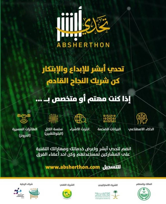 دعت وزارة الداخلية المهتمين في الذكاء الاصطناعي والبيانات الضخمة وإنترنت الأشياء وسلسلة الكتل (البلوكتيشين) والطائرات المسيرة (الدرونز) إلى الانضمام لتحدي أبشر للإبداع والابتكار، وذلك بعرض خدماتهم ومهاراتهم وليكونوا أحد أعضاء الفرق المشاركة.