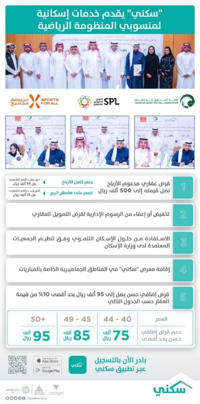 وتتضمن الاتفاقية التنسيق بين «سكني» وكل من «الاتحاد السعودي لكرة القدم ورابطة الدوري واتحاد الرياضة للجميع» لتقديم عروض خاصة لمنسوبيهم، تشمل الإسكان التنموي لمنسوبي المجال الرياضي وفق تنظيم الجمعيات المعتمدة في مناطق المملكة، وإقامة ندوات وحملات توعوية بأهمية الادخار وذلك بالتعاون مع المعهد العقاري، كذلك توفير خصم خاص على هامش الربح لمن يزيد دخلهم الشهري عن 14 ألف ريال، وأما من تقل رواتبهم عن 14 ألف ريال فسيحظون بدعم كامل للأرباح من إجمالي مبلغ التمويل.