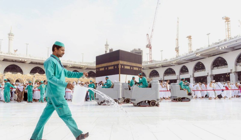 جانب من عمليات تعقيم أرضيات الحرم المكي اليومية.
