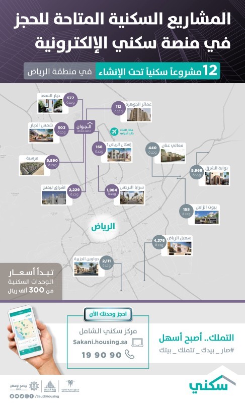 أعلن برنامج سكني التابع لوزارة الإسكان إمكانية حجز أكثر من 25 ألف وحدة سكنية متنوعة تتوزع في 12 مشروعاً حيوياً متكاملة الخدمات شمال وجنوب مدينة الرياض، ينفذها عدد من المطورين العقاريين المؤهلين ضمن برنامج الشراكة مع القطاع الخاص.