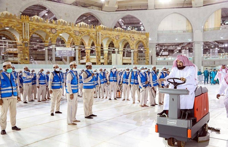 الرئيس العام لشؤون الحرمين يشارك بأعمال التطهير والتعقيم الاحترازية بالمسجد الحرام