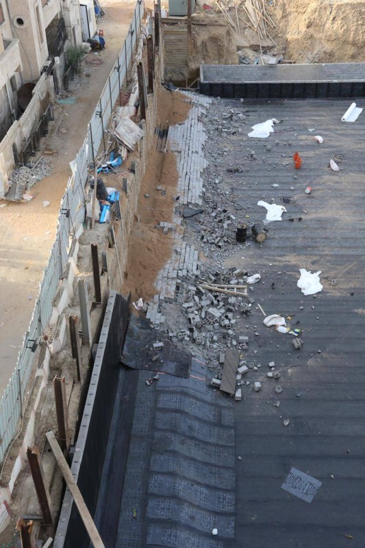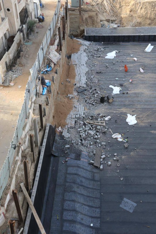 وتابع: بوصول الفرق للموقع اتضح أن الحالة عبارة عن انهيار سور من البلك (الإسمنتي) تحت مستوى الأرض نزولا بمقدار 4 أمتار (خلف الجدار الاستنادي) في موقع حفرية لإنشاء مشروع مبنى تبلغ أبعاده 50×50م، حيث سقط الجزء الغربي منه بطول 50 مترا وارتفاع 4 أمتار على عدد من العمالة.