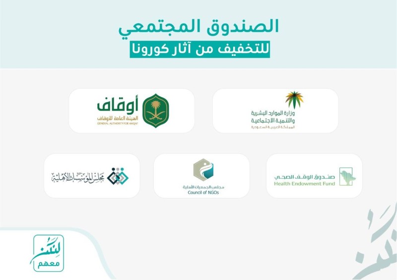 دشن وزير الموارد البشرية والتنمية الاجتماعية رئيس مجلس إدارة الهيئة العامة للأوقاف المهندس أحمد الراجحي، اليوم (الأربعاء)، الصندوق المجتمعي لتفعيل إسهام الأوقاف والقطاع غير الربحي في التخفيف من آثار وباء كورونا، وذلك بمبادرة من الوزارة والهيئة العامة للأوقاف، وبمشاركة صندوق الوقف الصحي ومجلس المؤسسات الأهلية ومجلس الجمعيات الأهلية وعدد من الأوقاف والجهات المانحة والشركات.