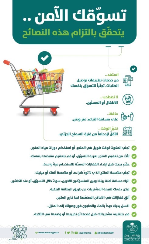 ضمن جهودها المستمرة في مكافحة ومواجهة انتشار فايروس كورونا، وتزامناً مع حلول شهر رمضان المبارك، بدأت وزارة الشؤون البلدية والقروية وأمانات المناطق حملة توعوية تدعو فيها المواطنين إلى التسوق الآمن عبر اتباع التعليمات الصادرة منها والجهات ذات العلاقة، والتأكد من تطبيق مراكز التسوق الاشتراطات الصحية التي تضمن السلامة والحفاظ على الصحة العامة وعدم انتشار عدوى فايروس كورونا المستجد.