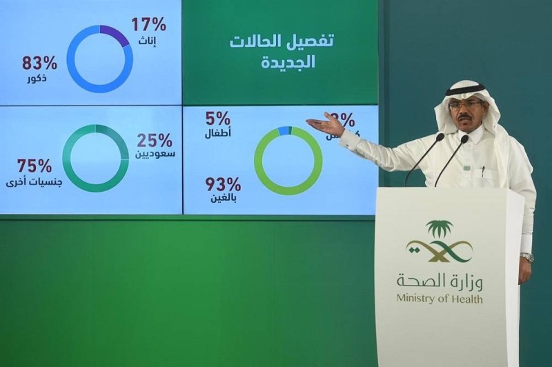 وتوزعت حالات الإصابة الجديدة بين مدن المملكة كالتالي: المدينة المنورة (396)، جدة (315)، مكة المكرمة (254)، الرياض (194)، الدمام (171)، الخبر (120)، الجبيل (48)، الهفوف (40)، القطيف (40)، الطائف (63)، ينبع (32)، راس تنورة (20)، صبيا (16)، تبوك (14)، وادي الفرع (13)، عنيزة (10)، بيش (10)، الدرعية (10)، هدبان (8)، حفر الباطن (6)، العيس (5)، الخرج (5)، سلوى (4)، القريات (4)، بريدة (3)، خميس مشيط (2)، المجاردة (2)، بقيق (2)، الظهران (2)، صفوى (2)، أملج (2)، الجفر (1)، المذنب (1)، البكيرية (1)، رابغ (1)، حدة (1)، الدائر (1)، المجمعة (1)، وتوزعت حالات الإصابة الجديدة بين مدن المملكة كالتالي: المدينة المنورة (396)، جدة (315)، مكة المكرمة (254)، الرياض (194)، الدمام (171)، الخبر (120)، الجبيل (48)، الهفوف (40)، القطيف (40)، الطائف (63)، ينبع (32)، راس تنورة (20)، صبيا (16)، تبوك (14)، وادي الفرع (13)، عنيزة (10)، بيش (10)، الدرعية (10)، هدبان (8)، حفر الباطن (6)، العيس (5)، الخرج (5)، سلوى (4)، القريات (4)، بريدة (3)، خميس مشيط (2)، المجاردة (2)، بقيق (2)، الظهران (2)، صفوى (2)، أملج (2)، الجفر (1)، المذنب (1)، البكيرية (1)، رابغ (1)، حدة (1)، الدائر (1)، المجمعة (1)، من بينها 17% للإناث و83% للذكور، وبحسب الفئة العمرية فإن المصابين من البالغين 93%، والأطفال 5%، وكبار السن (أكبر من 65 عاماً) 2%، فيما بلغت نسبة السعوديين من الإصابات الجديدة 25%، ونسبة المصابين من جنسيات أخرى 75%.