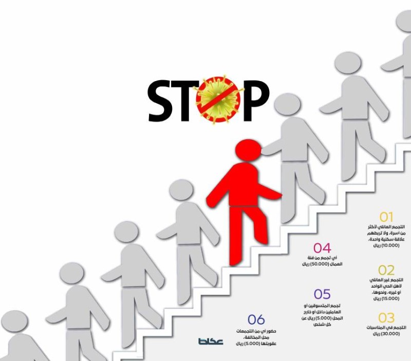 5 ـ أي تجمع للمتسوقين أو العاملين داخل أو خارج المحل التجاري بما يتجاوز الأعداد المنصوص عليها في الإجراءات الاحترازية والتدابير الوقائية، العقوبة (5.000) ريال عن كل شخص زاد على الأعداد المنصوص عليها بما لا يزيد على (100.000) ريال.