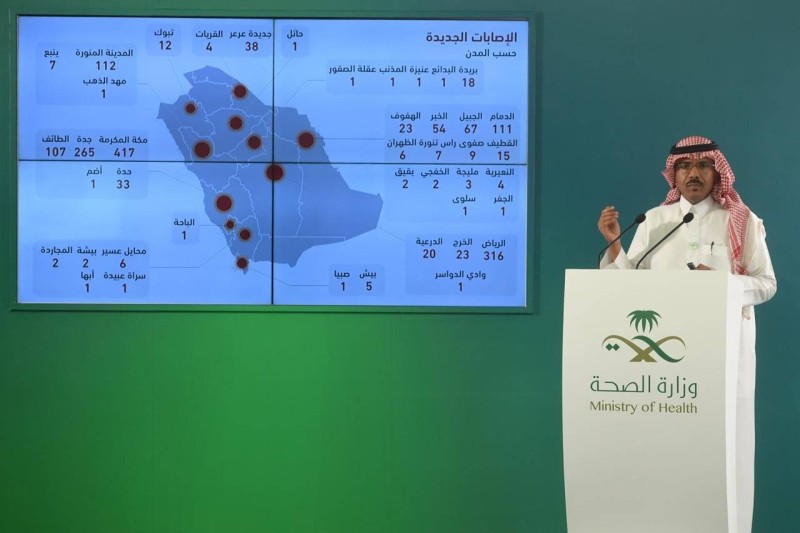 وتوزعت حالات الإصابة الجديدة بين مدن المملكة كالتالي: مكة المكرمة (417)، الرياض (316)، جدة (265)، المدينة المنورة (112)، الدمام (111)، الطائف (107)، الجبيل (67)، الخبر (54)، جديدة عرعر (38)، حدة (33)، الهفوف (23)، الخرج (23)، الدرعية (20)، بريدة (18)، القطيف (15)، تبوك (12)، صفوى (9)، رأس تنورة (7)، ينبع (7)، محايل عسير (6)، الظهران (6)، بيش (5)، النعيرية (4)، القريات (4)، مليجة (3)، المجاردة (2)، الخفجي (2)، بقيق (2)، بيشة (2)، الجفر (1)، أبها (1)، سراة عبيدة (1)، سلوى (1)، البدائع (1)، عنيزة (1)، المذنب (1)، عقلة الصقور (1)، مهد الذهب (1)، أضم (1)، الباحة (1)، صبيا (1)، حائل (1)، وادي الدواسر (1).
