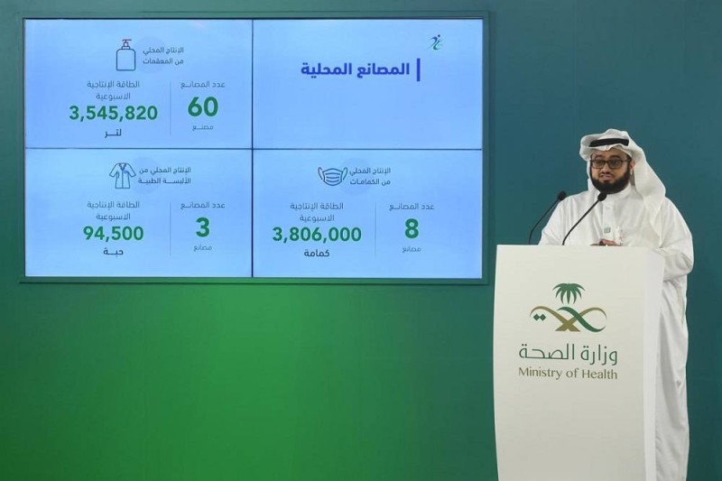 وأضاف خلال مشاركته في المؤتمر الصحفي المشترك للإيجاز اليومي لكشف مستجدات فايروس كورونا المستجد (كوفيد-19) في المملكة، أن مصانع الكمامات بلغ عددها 8 مصانع، وتصل طاقتها الإنتاجية الأسبوعية إلى 3.806.000 كمامة، بينما يصل عدد مصانع الألبسة الطبية إلى 3 وطاقتها الأنتاجية الأسبوعية 94.500 من الألبسة.