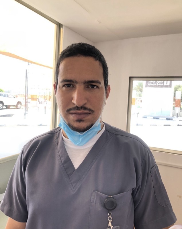 يقف عارف العنزي أخصائي تمريض في الصفوف الأمامية في مواجهة فايروس كورونا (كوفيد - 19) أمام مستشفى الحالات العاجلة في حائل، ويبدأ عارف دوامه من الساعة السادسة صباحا وحتى ٤ عصراً في الكشف والفرز للمراجعين والأطباء والممرضين والموظفين قبل دخولهم المستشفى في مواجهة أشد الأوبئة العالمية التي أودت بحياة الآلاف من البشر.