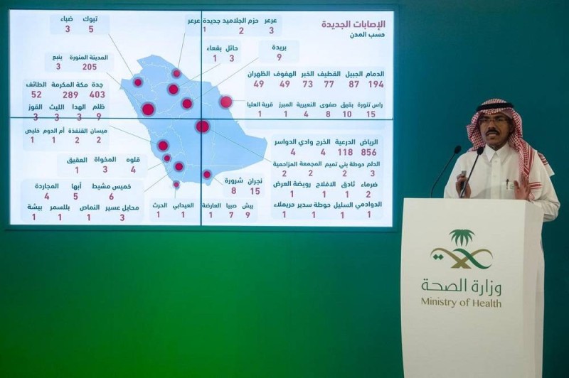 وتوزعت حالات الإصابة الجديدة بين مدن المملكة كالتالي: الرياض (856)، جدة (403)، مكة المكرمة (289)، المدينة المنورة (205)، الدمام (194)، الدرعية (118)، الجبيل (87)، القطيف (77)، الخبر (73)، الطائف (52)، الهفوف (49)، الظهران (49)، راس تنورة (15)، نجران (15)، بقيق (10)، بريدة (9)، ظلم (9)، بيش (9)، صفوى (8)، شرورة (8)، صبيا (7)، خميس مشيط (6)، أبها (5)، تبوك (5)، المجاردة (4)، النعيرية (4)، قلوة (4)، الخرج (4)، وادي الدواسر (4)، محايل عسير (3)، ينبع (3)، الهدا (3)، الليث (3)، المخواة (3)، ضباء (3)، القوز (3)، حائل (3)، عرعر (3)، الدلم (3)، ميسان (2)، القنفذة (2)، حزم الجلاميد (2)، حوطة بني تميم (2)، المجمعة (2)، المزاحمية (2)، ضرماء (2)، المبرز (1)، النماص (1)، بللسمر (1)، قرية العليا (1)، بيشة (1)، أم الدوم (1)، العقيق (1)، خليص (1)، العارضة (1)، العيدابي (1)، الحرث (1)، بقعاء (1)، رويضة العرض (1)، ثادق (1)، ليلى (1)، جديدة عرعر (1)، الدوادمي (1)، السليل (1)، حوطة سدير (1)، حريملاء (1).